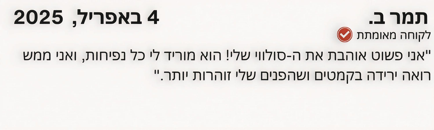• “אני ממש רואה ומרגישה את ההבדל בזוהר, בניקיון ובמרקם של העור שלי. המכשיר של סולווי עשה לי פלאים ועוזר לי לפנות זמן לעצמי בשגרה אני פשוט מאוהבת בו!”